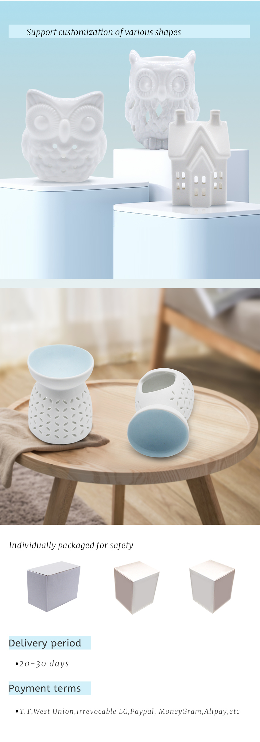 The Oil Candle Burner is made of fine white procelain. It is a cute oil candle burner not only for clean home air but for home decor. Its surface is treated with matte color and the body is hollow.